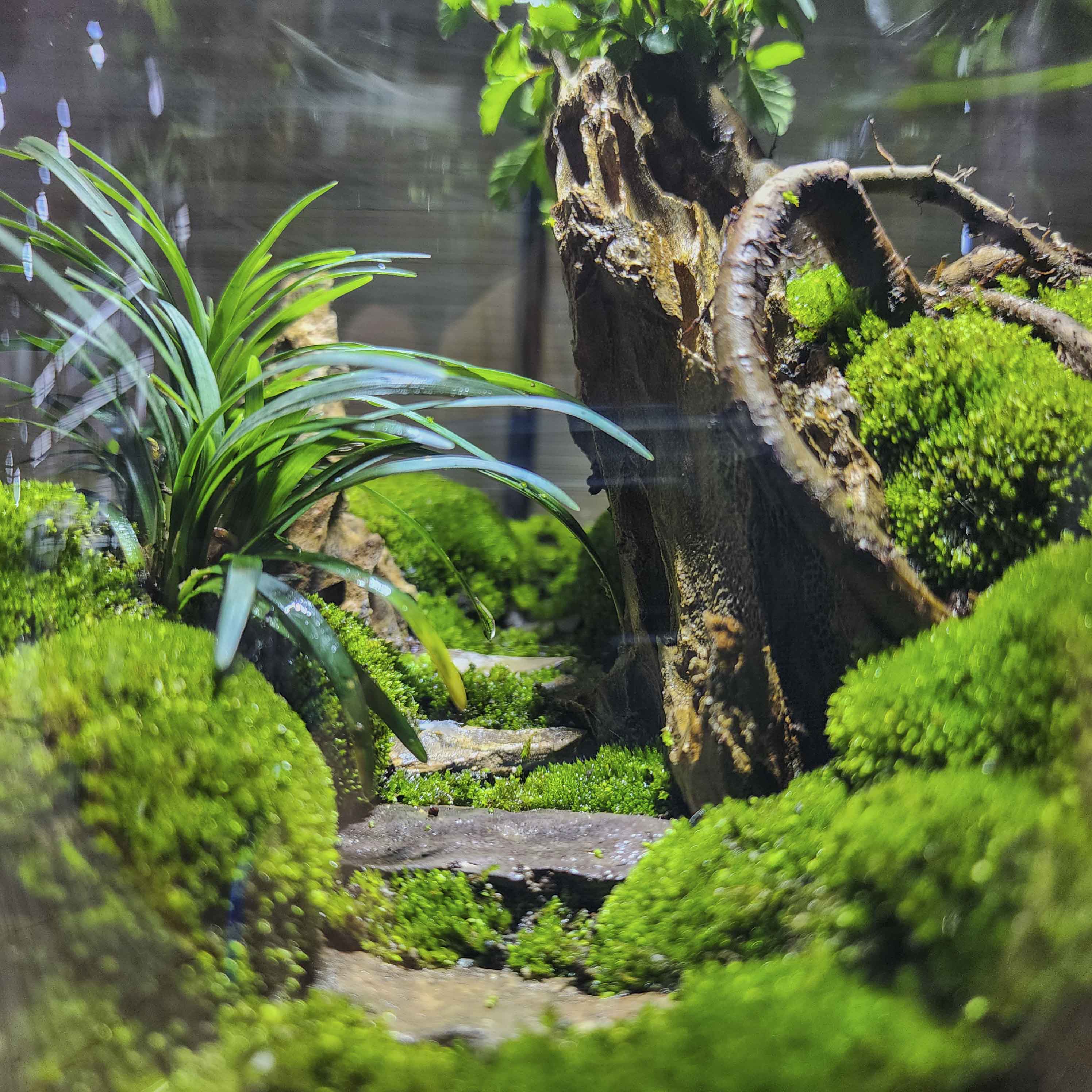 Trong terrarium, rêu không chỉ là vật trang trí mà còn là một phần của hệ sinh thái nhỏ. Chúng giúp cân bằng môi trường sống bằng cách hấp thụ CO2 và thải ra oxy.